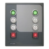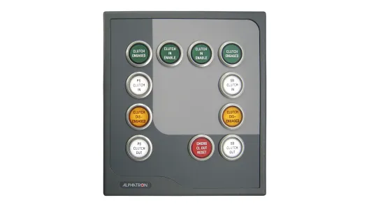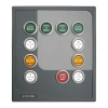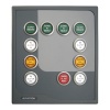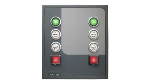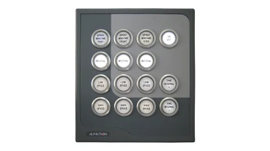 The control panels come in a width variety, specially made for the functionality needed according to required specifications. The AlphaControlPanels are produced in three standards: Small, Medium and Large. Within these sizes, a customer can decide what kind of functionality is needed, how many buttons, lights or if even a joystick is needed. The panel will be delivered with a foil which can be engraved with text or text with a drawing. The buttons, with many different switching varieties, and lights can also be delivered with or without an engraved surface.