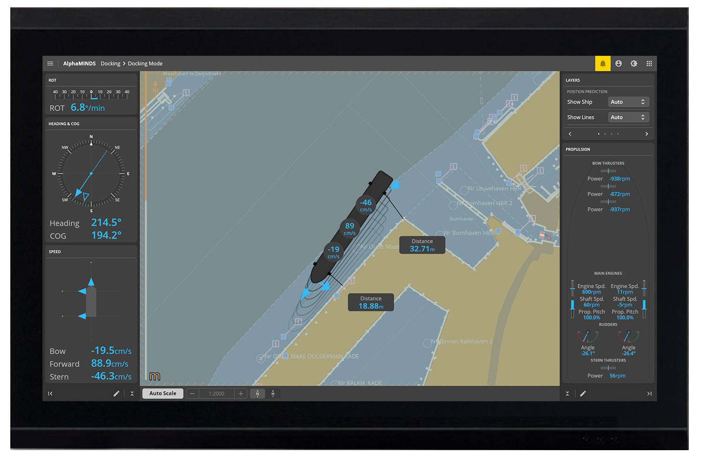 The AlphaMINDS Docking application is capable to plot a scale model of the vessel itself at the exact position in a ENC chart with a calculated prediction of the path of the vessel including the distance from vessels’ hull to the quay as reference into the current map. The officer on watch is now able to have a good overview of the vessel when it enters the harbour and starts docking procedures. When a vessel is equipped with this product, the captain or officer on watch has almost similar information as a local pilot and available in every situation